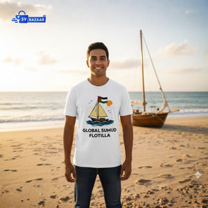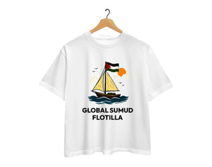 The Global Sumud Flotilla T-Shirt symbolizes courage, resistance, and unity across borders. Featuring a beautifully illustrated sailboat carrying the Palestinian flag, it represents hope that continues to rise, no matter the tide.