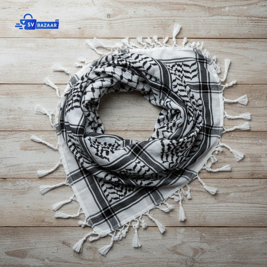 The Palestinian Pattern Keffiyeh Roomal Scarf in white and black is a versatile and stylish accessory. Known for its traditional and cultural significance, this unisex scarf can be worn in various ways, offering both protection from the elements and a fashionable statement.